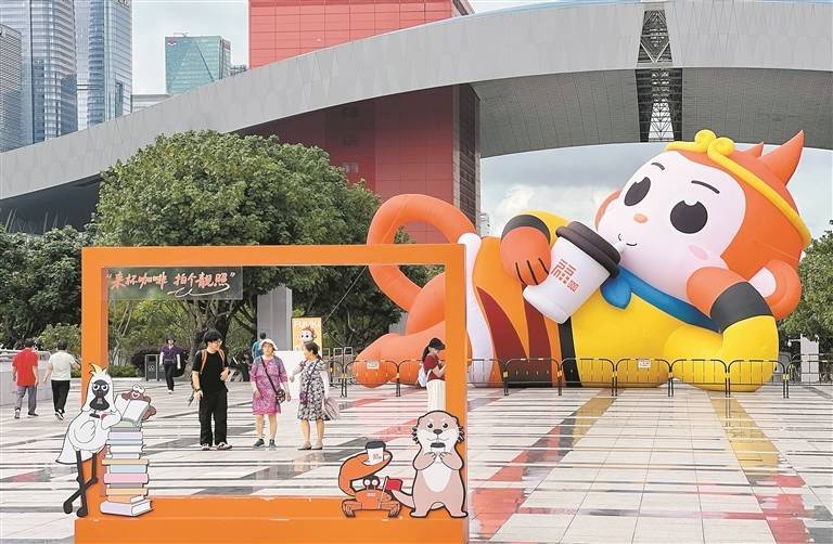 “福气家族”是福田打造的知名文旅IP。日前,悟空装扮的福气巨型气膜装置在市民中心展示,以最松弛的形态,品最美味的咖啡,吸引路过的市民游客打卡拍照。